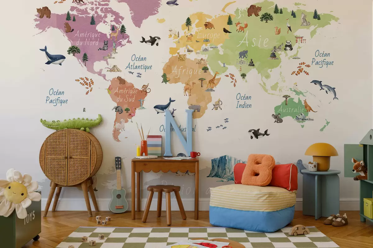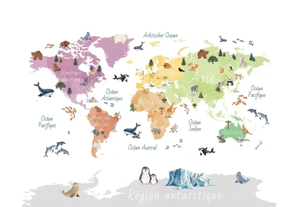Fototapeta Mapa w stylu akwareli przedstawiająca zwierzęta, rośliny i zabytki architektury. Napisy w języku francuskim Nr c00009fr