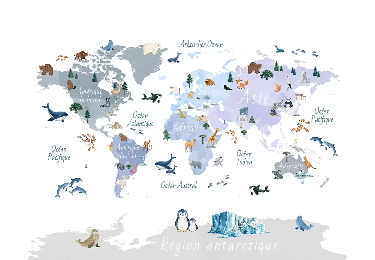 Fototapeta Niebieska mapa w stylu akwareli, przedstawiająca zwierzęta, rośliny i zabytki architektury. Napisy w języku francuskim Nr c00009frv1