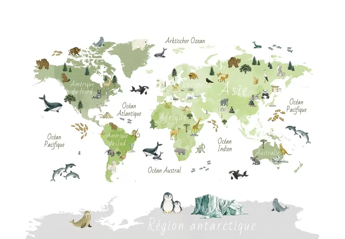 Fototapeta Mapa w stylu akwareli przedstawiająca zwierzęta, rośliny i zabytki architektury. Napisy w języku francuskim Nr c00009frv2