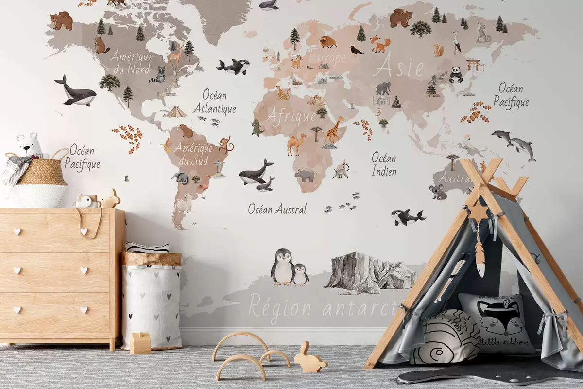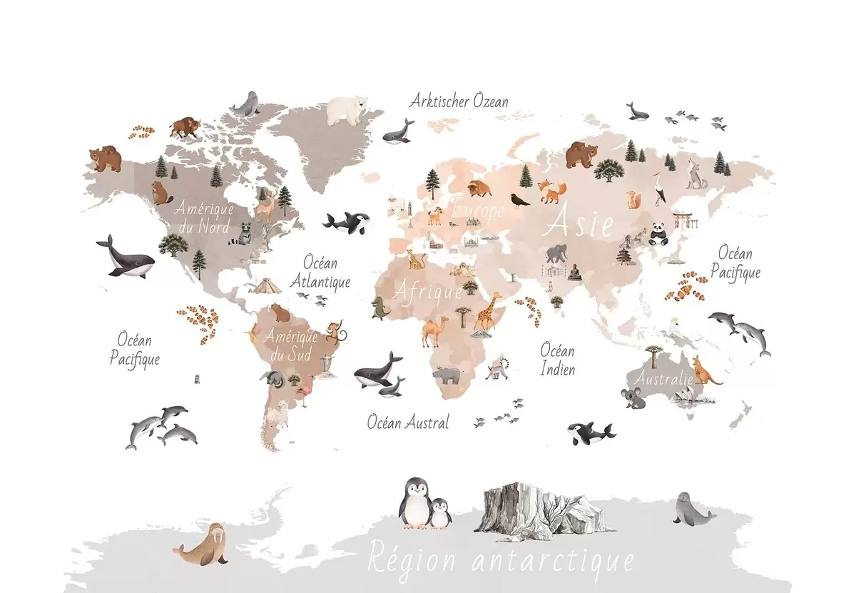 Fototapeta Mapa w stylu akwareli w kolorze beżowym, przedstawiająca zwierzęta, rośliny i zabytki architektury. Napisy w języku francuskim Nr c00009frv3