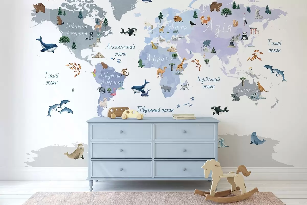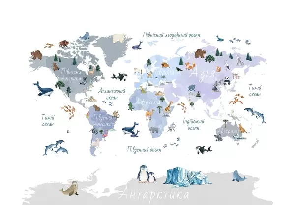Fototapeta Niebieska mapa w stylu akwareli, przedstawiająca zwierzęta, rośliny i zabytki architektury. Napisy w języku ukraińskim Nr c00009ukv1