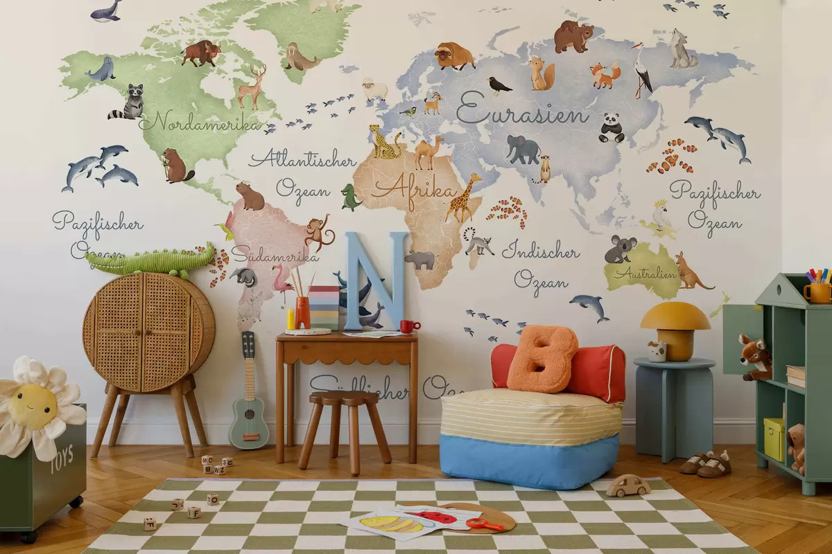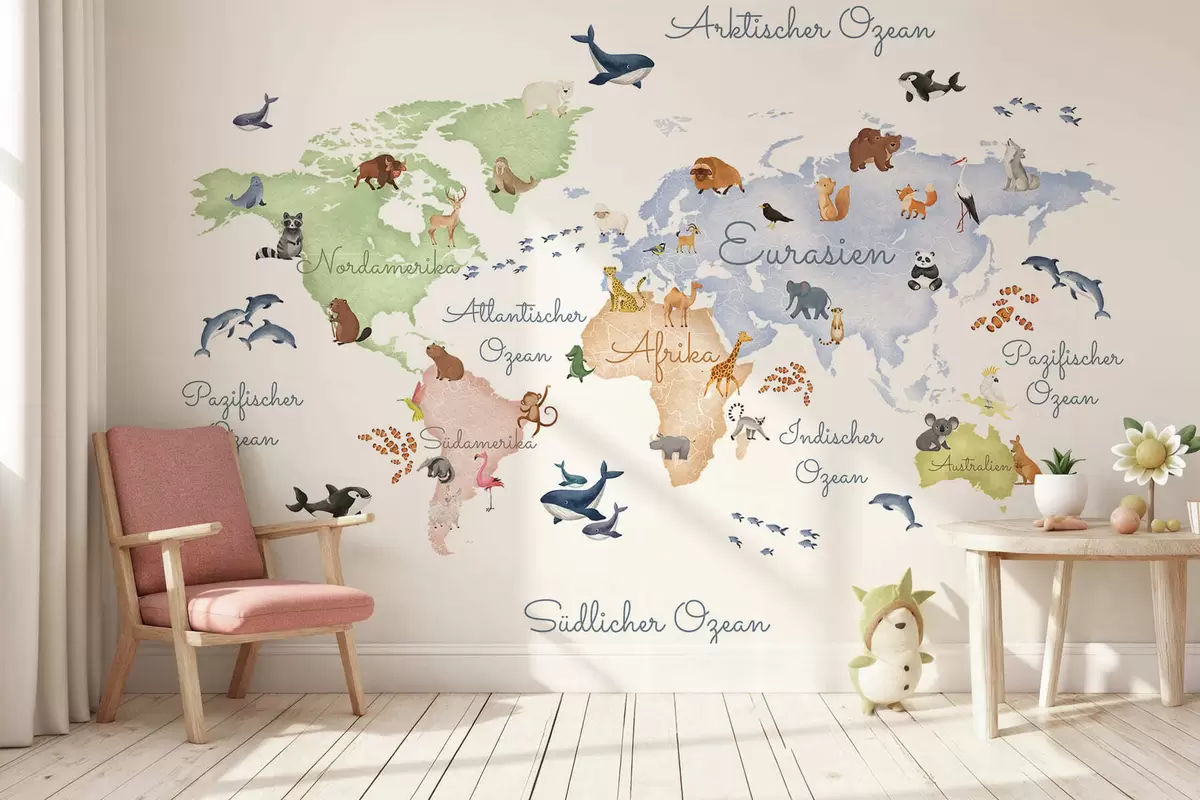 Fototapeta Mapa w stylu akwareli przedstawiająca zwierzęta. Napisy w języku niemieckim Nr c00012de