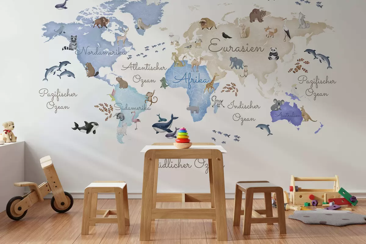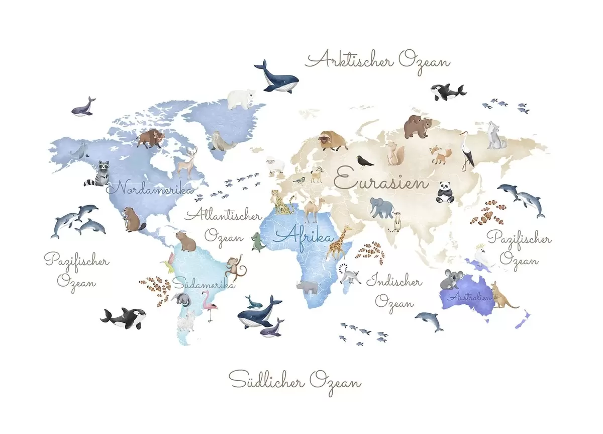 Fototapeta Niebieska mapa w stylu akwareli z motywami zwierzęcymi. Napisy w języku niemieckim Nr c00012dev1
