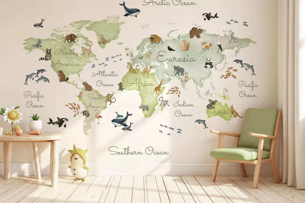 Fototapeta Mapa w stylu akwareli w kolorze zielonym z motywami zwierzęcymi. Napisy w języku angielskim Nr c00012env2