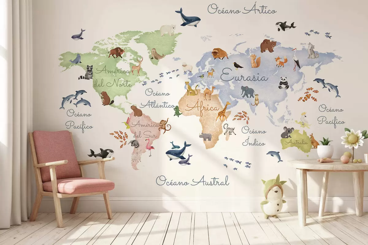 Fototapeta Mapa w stylu akwareli przedstawiająca zwierzęta. Napisy w języku hiszpańskim Nr c00012es