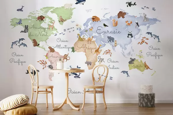 Fototapeta Mapa w stylu akwareli przedstawiająca zwierzęta. Napisy w języku francuskim Nr c00012fr