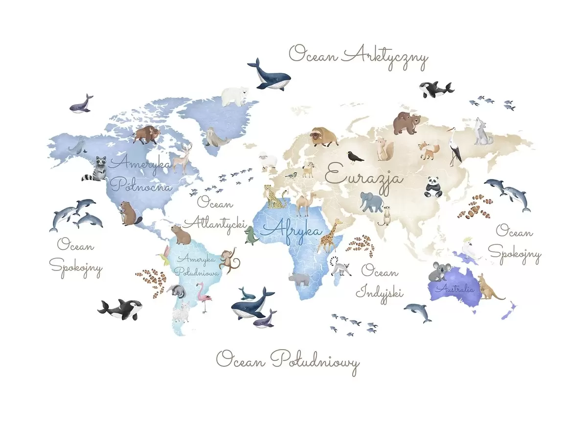 Fototapeta Niebieska mapa w stylu akwareli z motywami zwierzęcymi. Napisy w języku polskim Nr c00012plv1