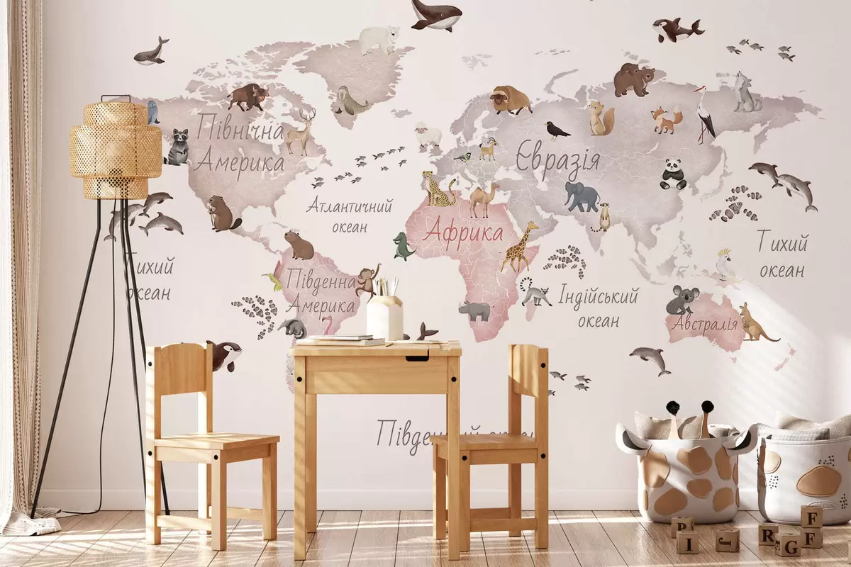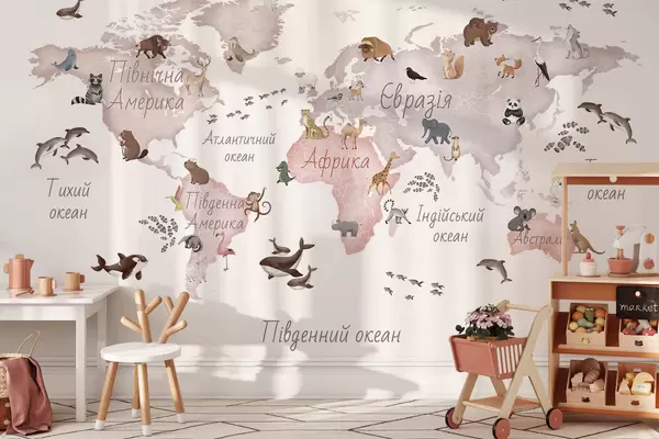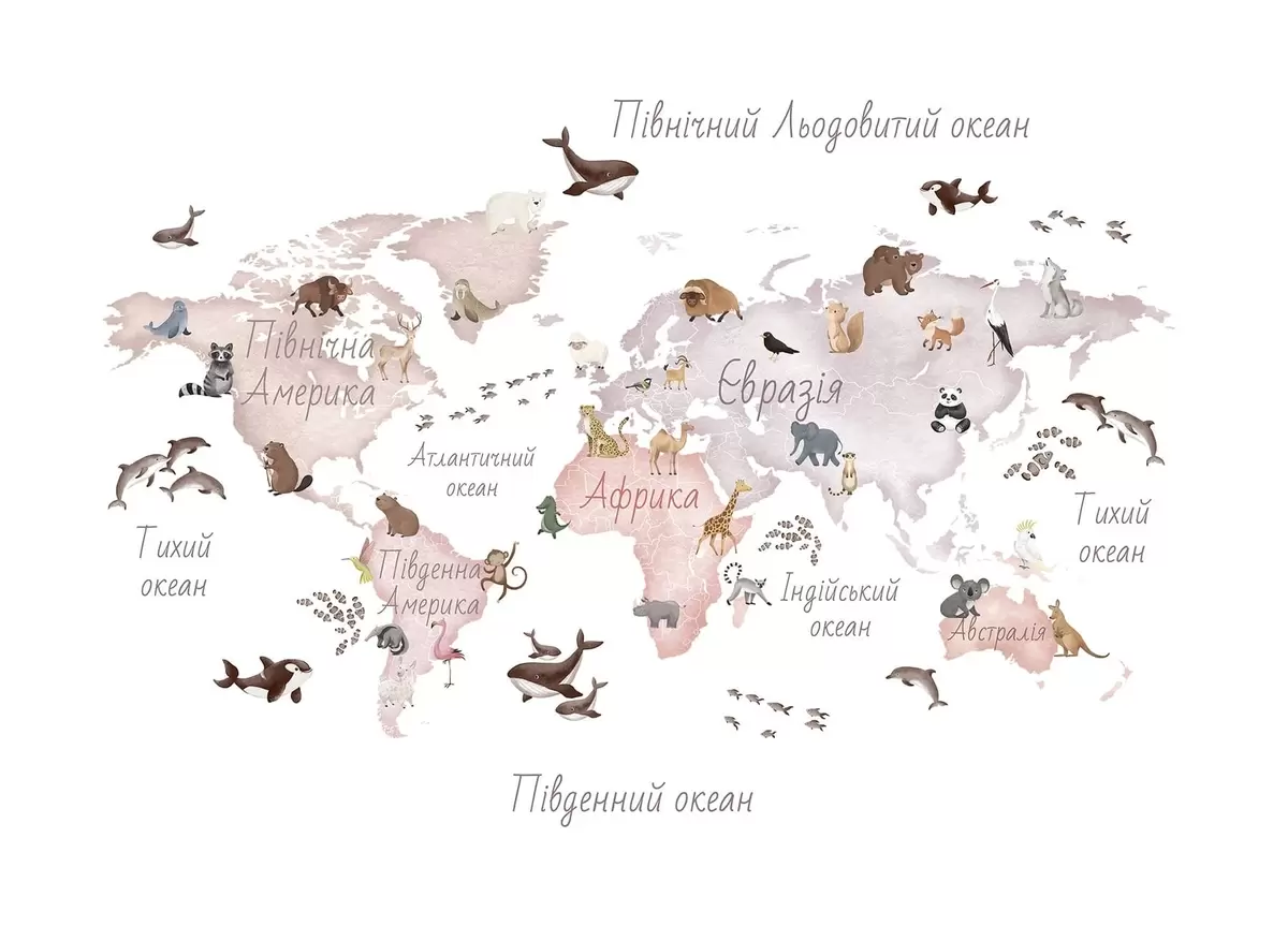 Fototapeta Mapa w stylu akwareli w kolorze beżowym z motywami zwierzęcymi. Napisy w języku ukraińskim Nr c00012ukv3
