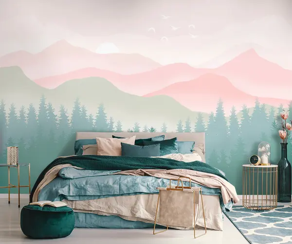 Fototapeta Mgliste góry z sosnowym lasem, delikatne naturalne kolory, różowy i zielony Nr u98774