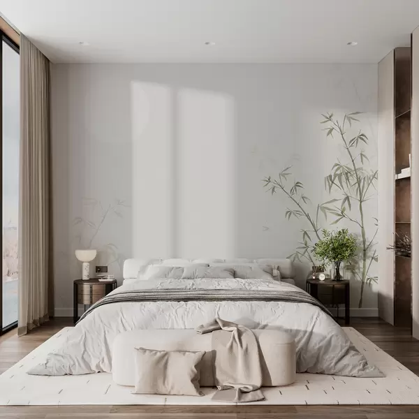 Fototapeta Minimalizm w stylu Japandi, roślina bambusowa i słońce Chinoiserie, zielony kolor Nr w00547