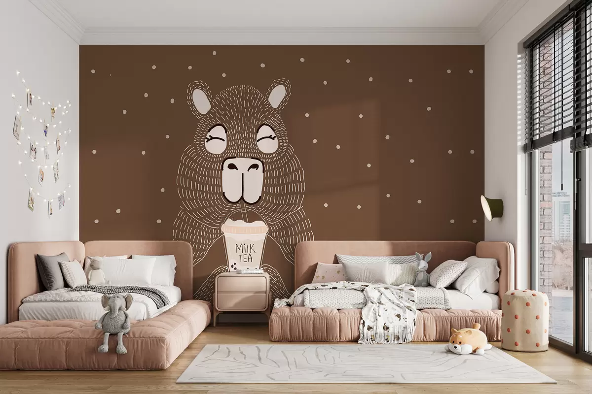 Fototapeta Duża urocza kapibara z bąbelkową koszulką w minimalistycznym stylu kropek na brązowym tle w kropki Nr w01122v2