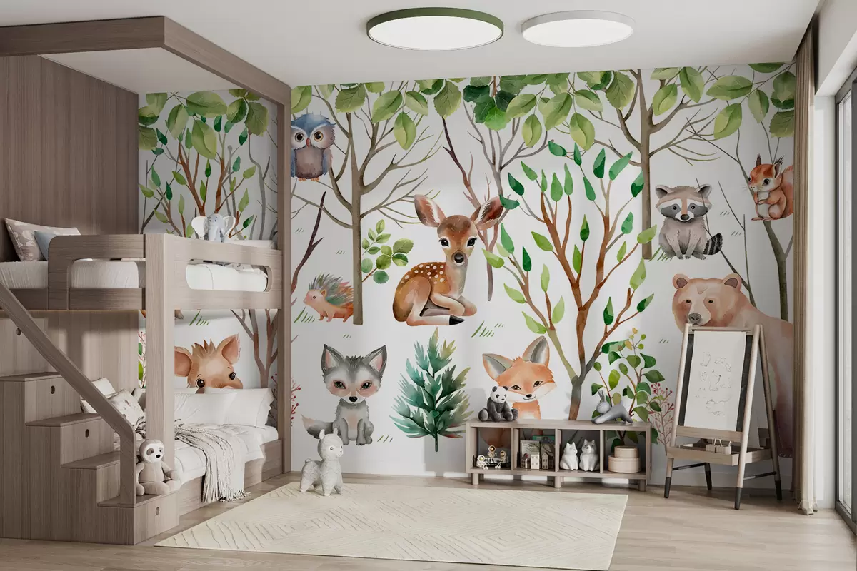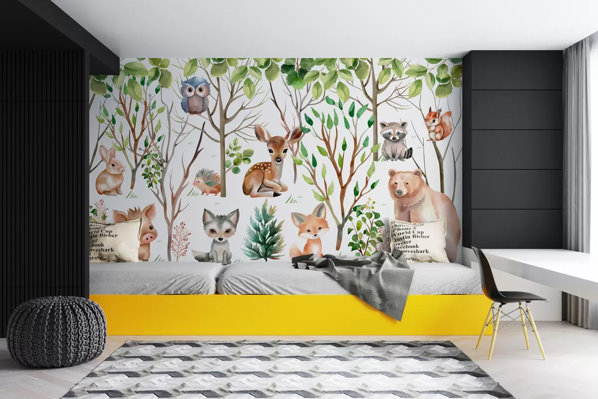 Fototapeta Tapeta dla dzieci zwierzęta z lasu. Kolorowa tapeta na białym tle Nr w01127
