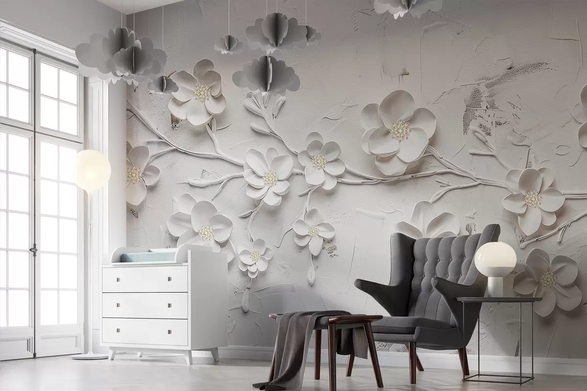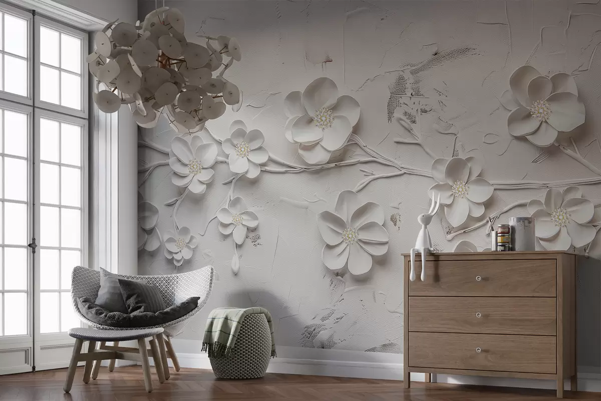 Fototapeta Białe teksturowane tło z trójwymiarowymi białymi kwiatami w pełnym rozkwicie, połączonymi gałęziami, minimalistyczne i eleganckie Nr w01226