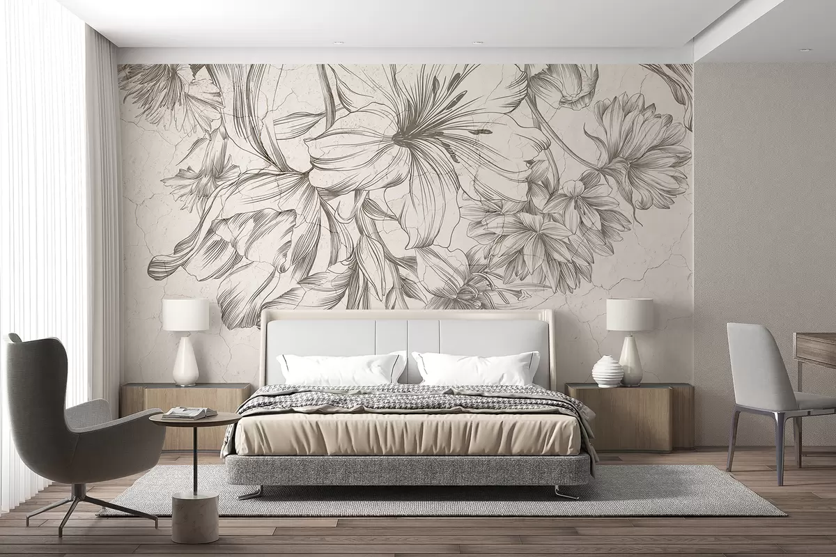 Fototapeta Czarno-biały szkic przedstawiający grafikę dużych kwiatów Nr w01253