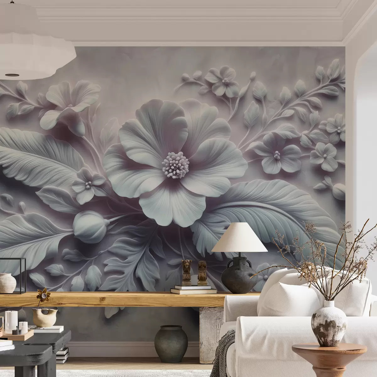Fototapeta Trójwymiarowa płaskorzeźba ścienna przedstawiająca pióra i kwiaty, z dużym makiem w jasnoniebieskich kolorach Nr w01340v2