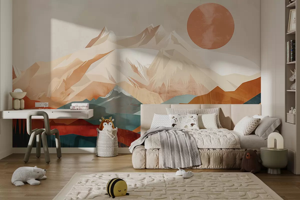 Fototapeta Boho bliss: spokojny krajobraz gór, drzew i słońca Nr w01358