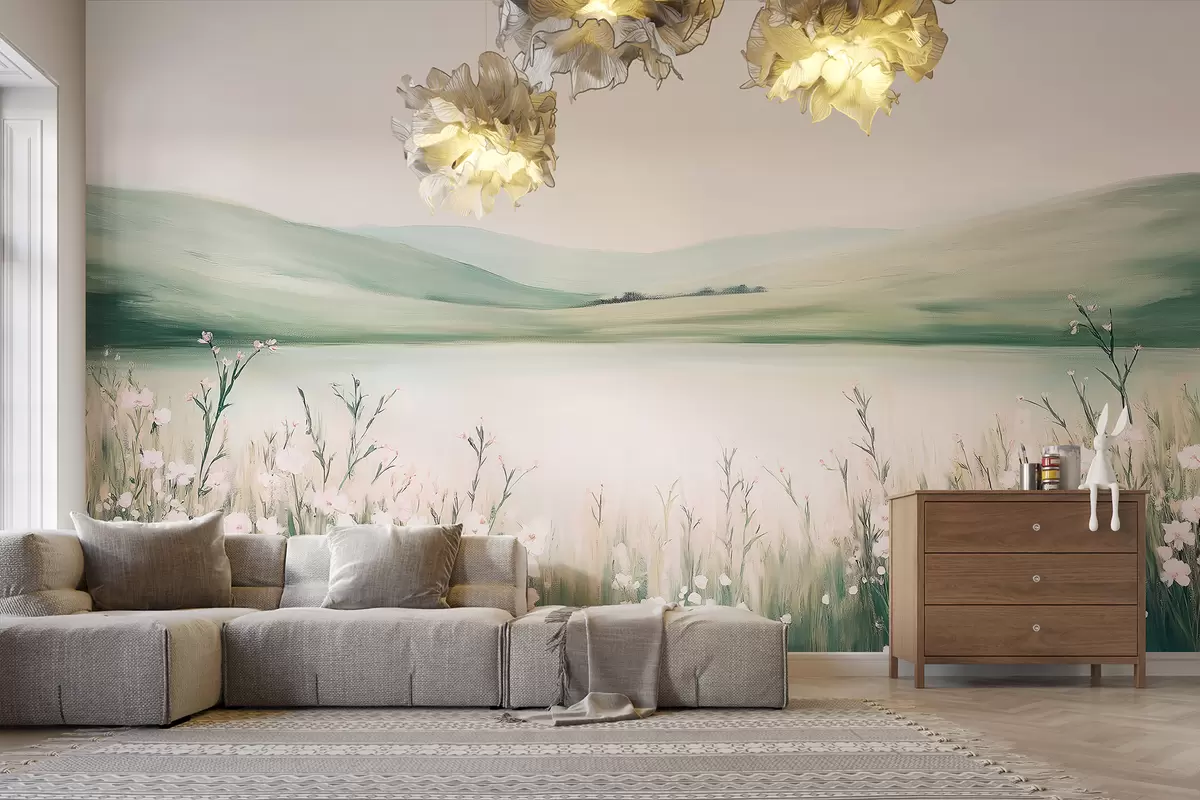 Fototapeta Łąka kwiatowa, krajobraz naturalny, jezioro, różowe kwiaty, zielone wzgórza Nr w01387