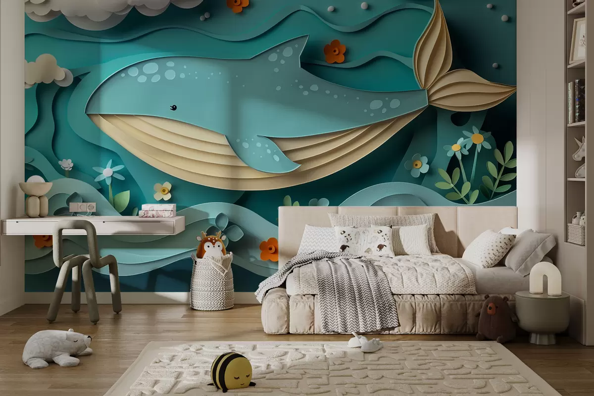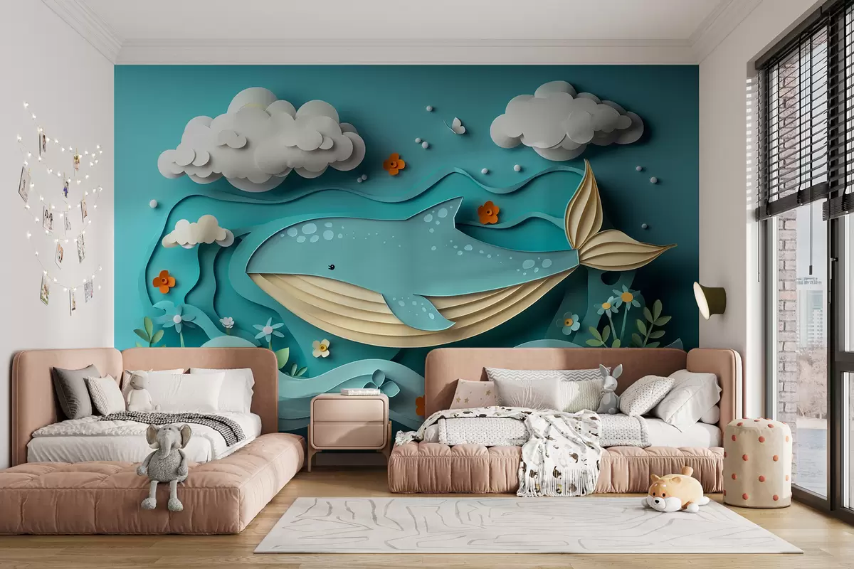 Fototapeta Zabawny wieloryb w chmurach w stylu wycinanki papierowej, efekt 3D Nr w01496