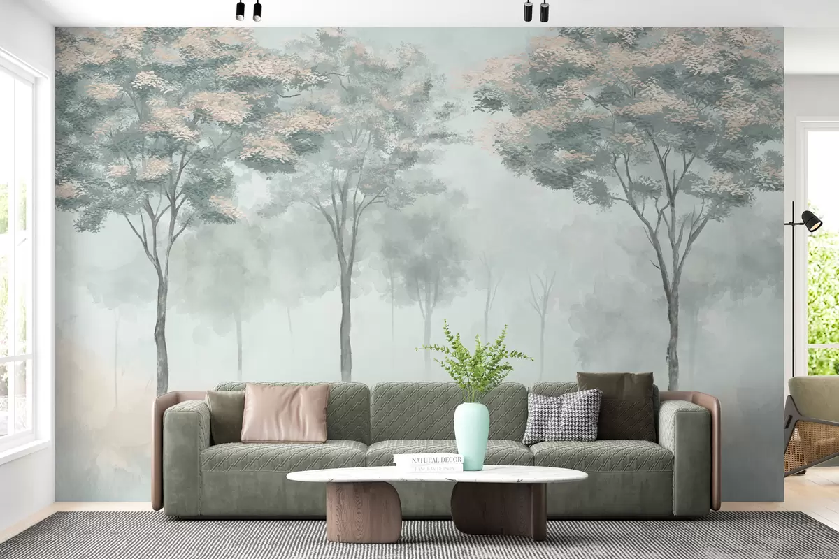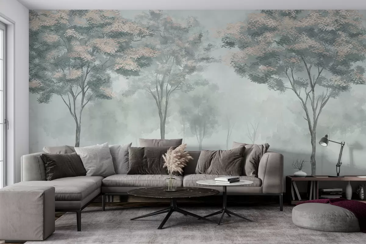 Fototapeta Sylwetka mglistego lasu w kolorach zielonym, jasnoszarym i beżowym Nr w01599