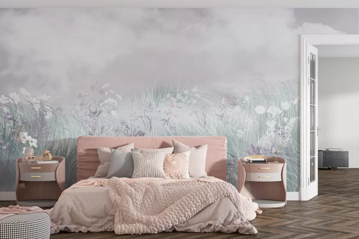 Fototapeta Dzikie kwiaty i trawy z różowawym niebem i chmurami Nr w01624v1