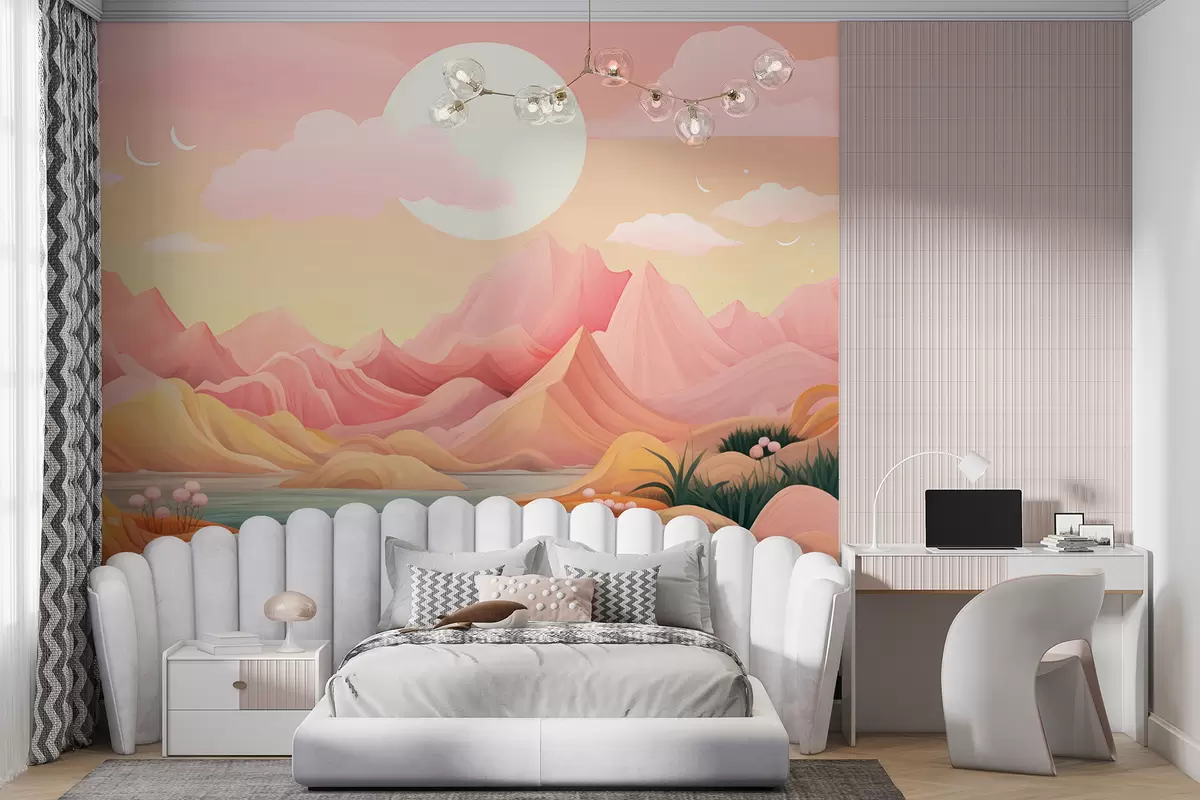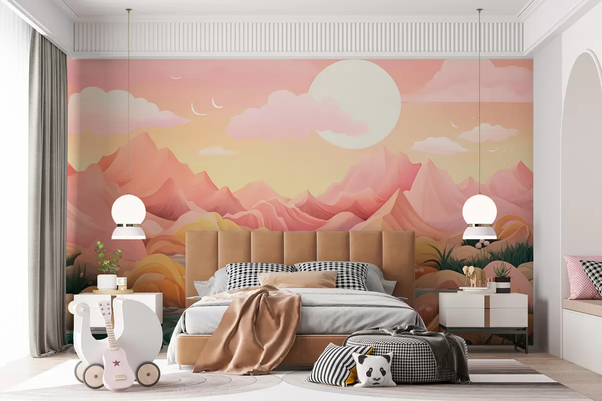 Fototapeta Fantastyczny, pastelowy krajobraz z delikatnie różowymi i brzoskwiniowymi górami Nr w01656