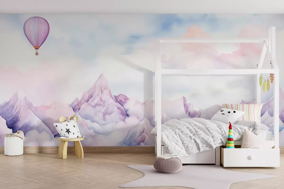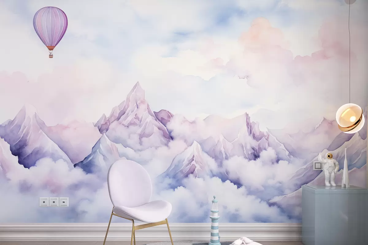 Fototapeta Balon powietrzny w górach, akwarela, delikatne eteryczne kolory Nr w01789
