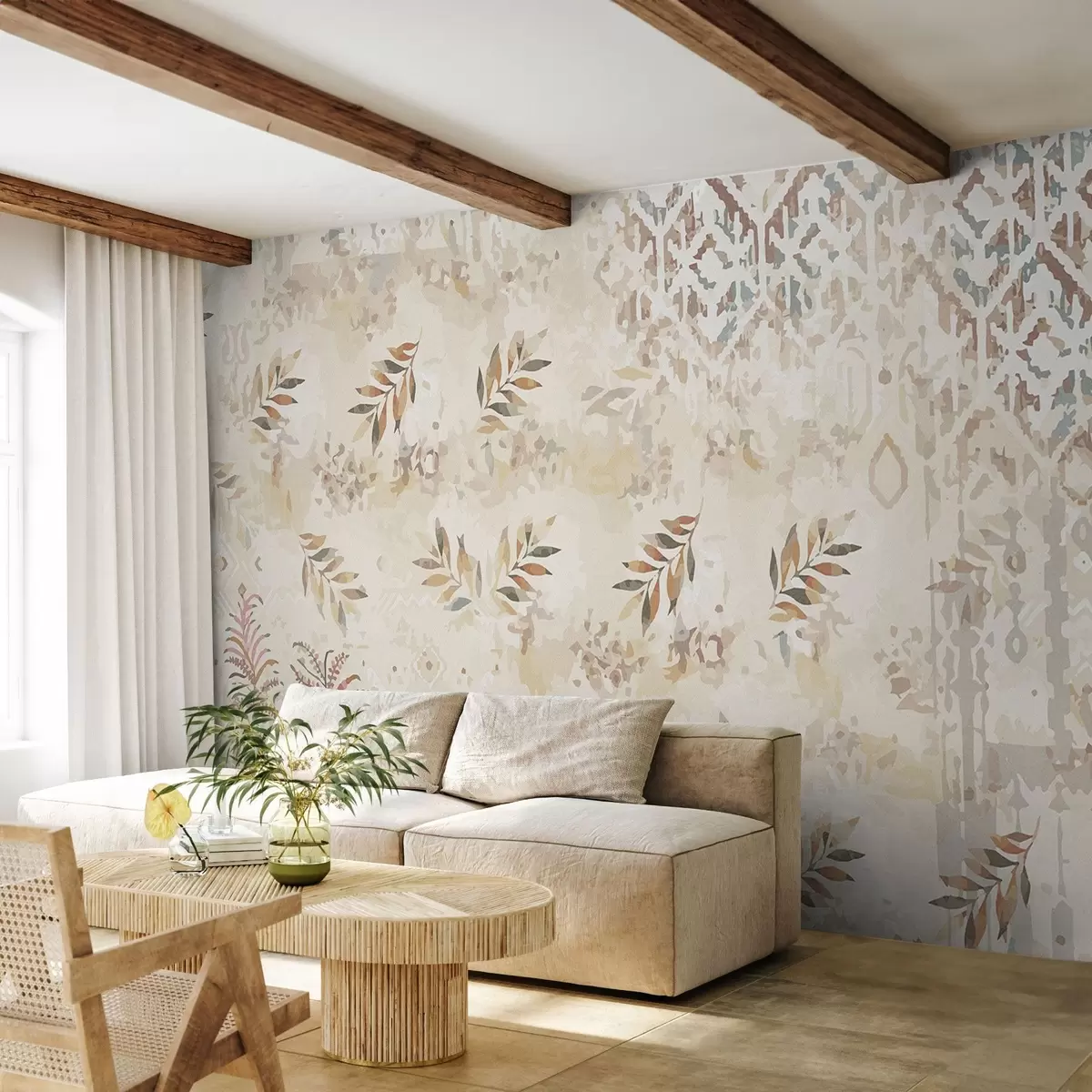 Fototapeta tapeta w stylu retro z wzorami, elementami przetarć, plam i liści, w beżowej kolorystyce Nr w01955
