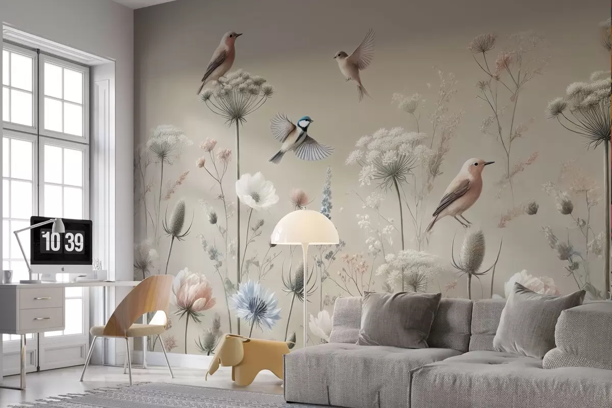 Fototapeta Delikatne polne kwiaty z ptakami na beżowym tle Nr w01958