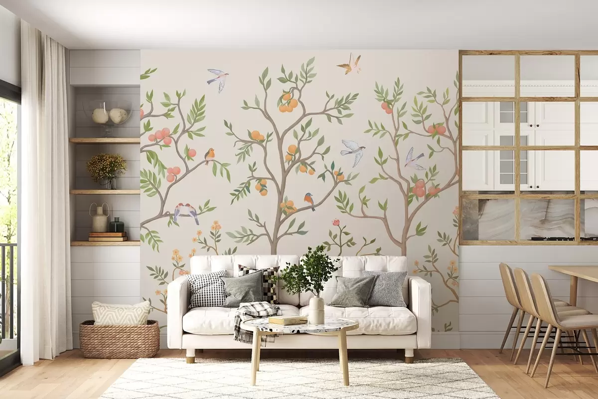 Fototapeta Wzór chinoiserie z ptakami, wijącymi się drzewami, owocami i kwiatami Nr w02128