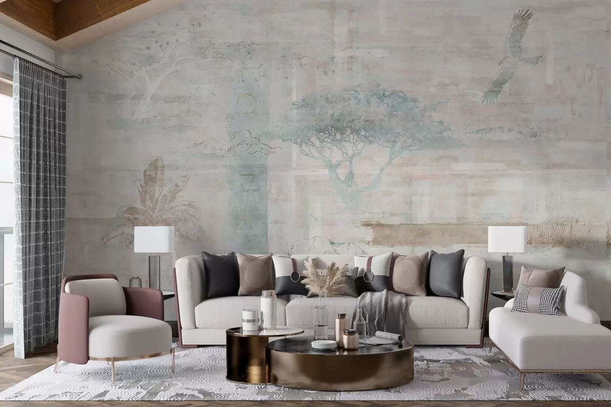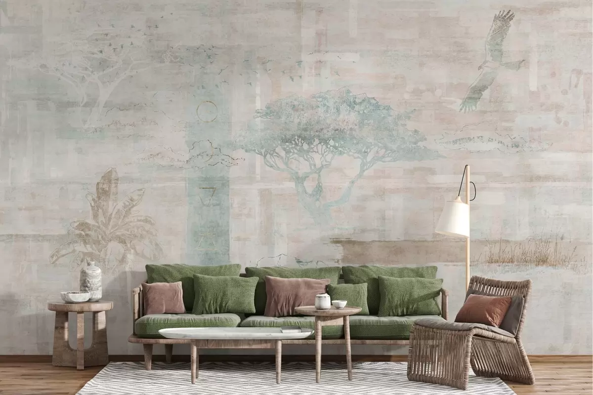 Fototapeta Projekt z efektem grunge w stylu vintage z drzewami, orłem i elementami geometrycznymi Nr w02130