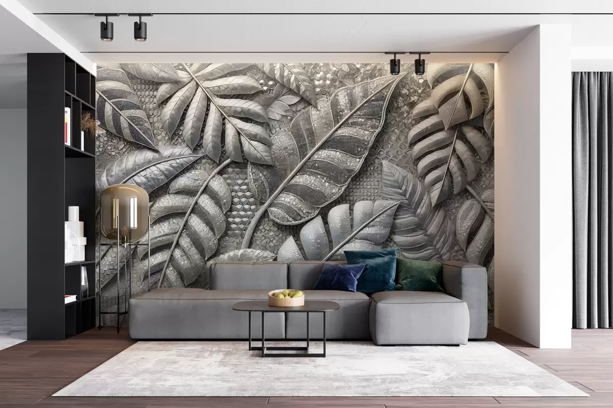 Fototapeta Duże tropikalne liście w delikatnych srebrnych odcieniach, w stylu teksturowanej mozaiki Nr w02135