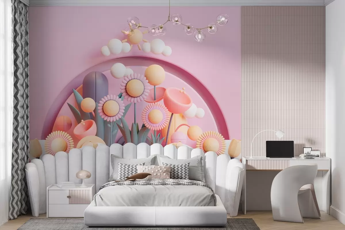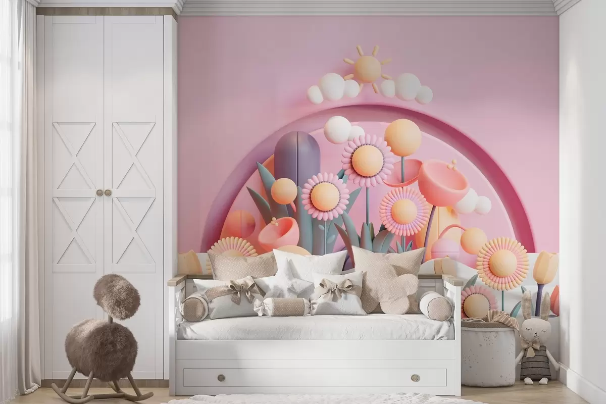 Fototapeta Dziecięca tapeta w stylu 3D z kwiatami i chmurami w różowych odcieniach Nr w02136