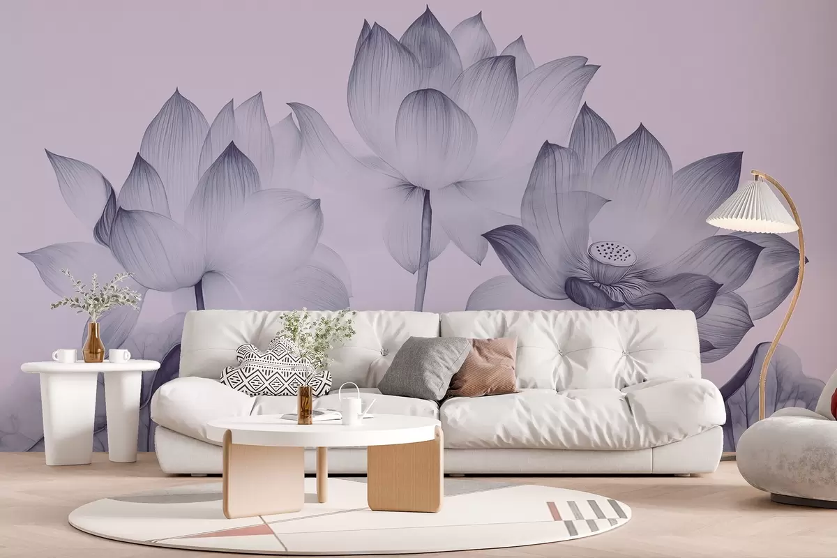 Fototapeta Trzy lotosy z liśćmi w stylu chińskiego malarstwa w kolorze niebieskim Nr w02146v2