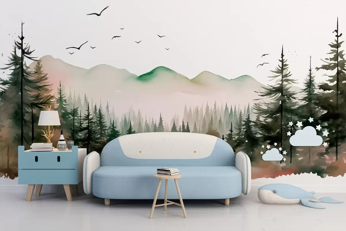 Fototapeta Akwarelowe leśne i górskie krajobrazy, zielone i różowe kolory Nr w02150v1