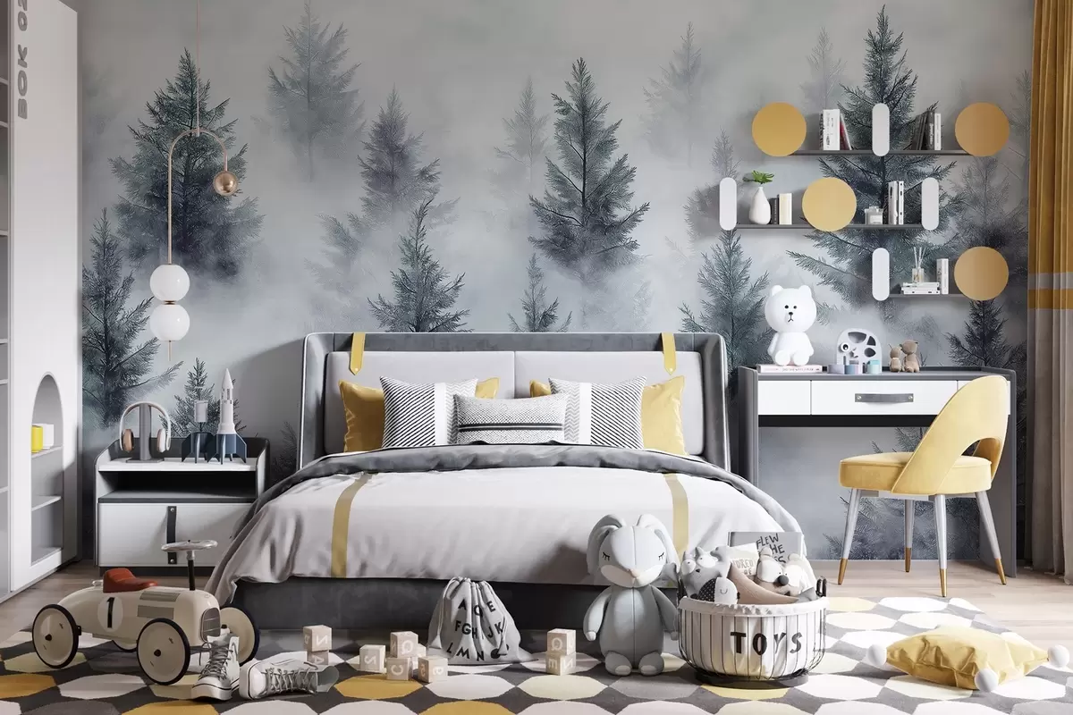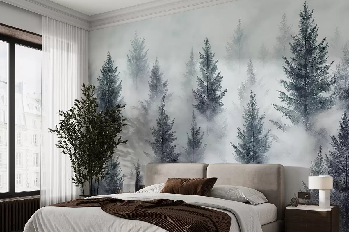 Fototapeta Piękny las z sosnami, mgła, krajobrazy natury, szare kolory Nr w02222v2