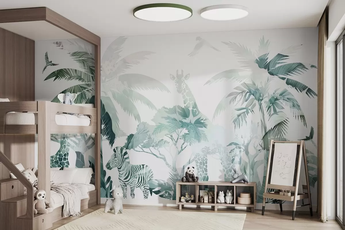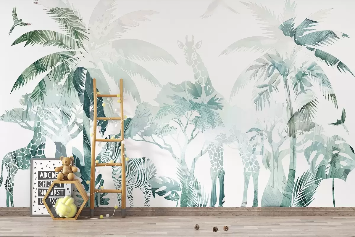Fototapeta Zwierzęta safari, palmy, dżungla, zebra, żyrafa, delikatne zielone kolory Nr w02267