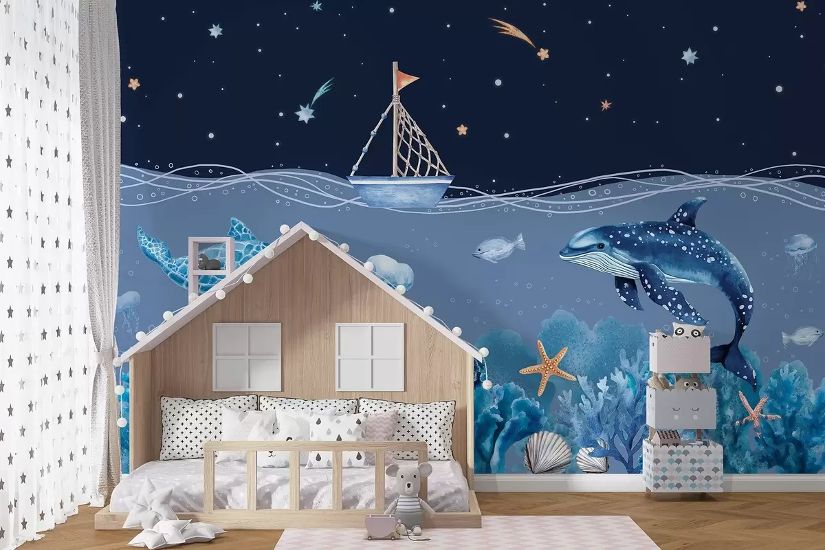 Fototapeta Życie morskie, styl akwareli, koralowce, łódź, delfin, meduza, rozgwieżdżone nocne niebo, niebieskie kolory Nr w02310