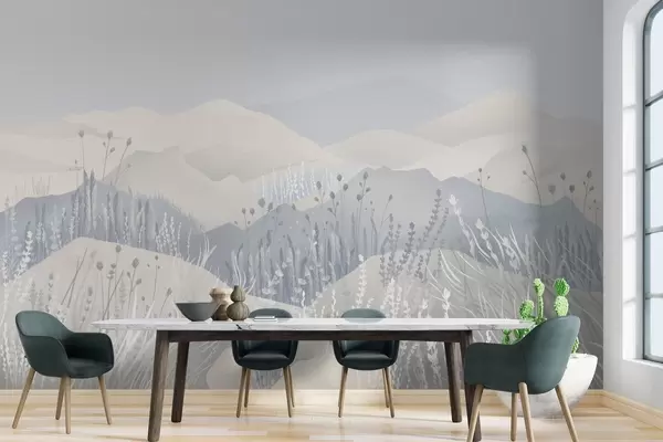 Fototapeta Zamglone góry, polne trawy i kwiaty w niebieskich odcieniach Nr w02317v1