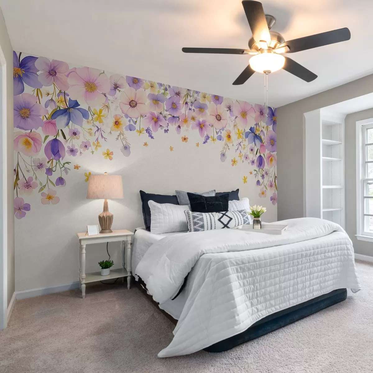 Fototapeta Delikatna kompozycja kwiatowa z akwarelowymi kwiatami w delikatnych pastelowych odcieniach różu, fioletu i żółci. Kwiaty delikatnie opadają kaskadowo z góry, pozostawiając jasne, wzorzyste tło poniżej. Nr w02345