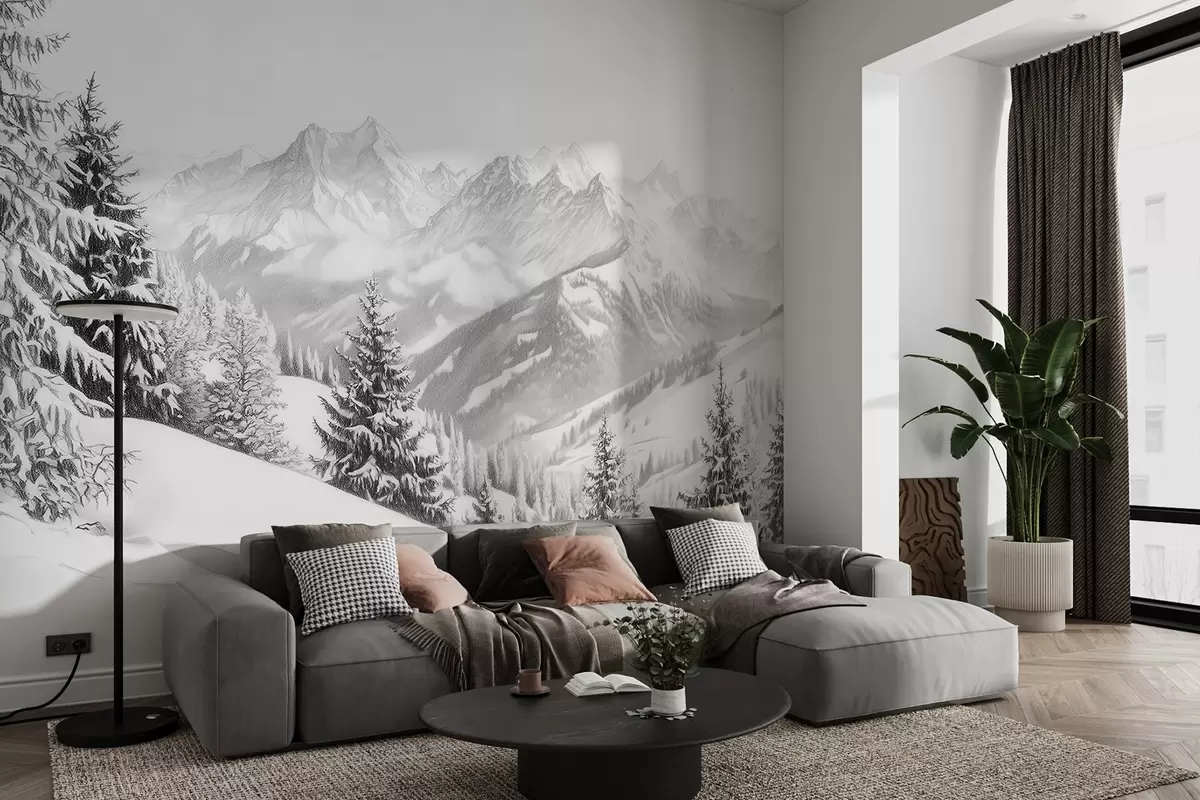 Fototapeta Zima w górach, las, Alpy, rysunek ołówkiem, krajobrazy natury Nr w02353