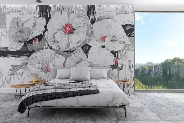 Fototapeta Czarno-białe kwiaty z czerwonymi środkami Nr w02477