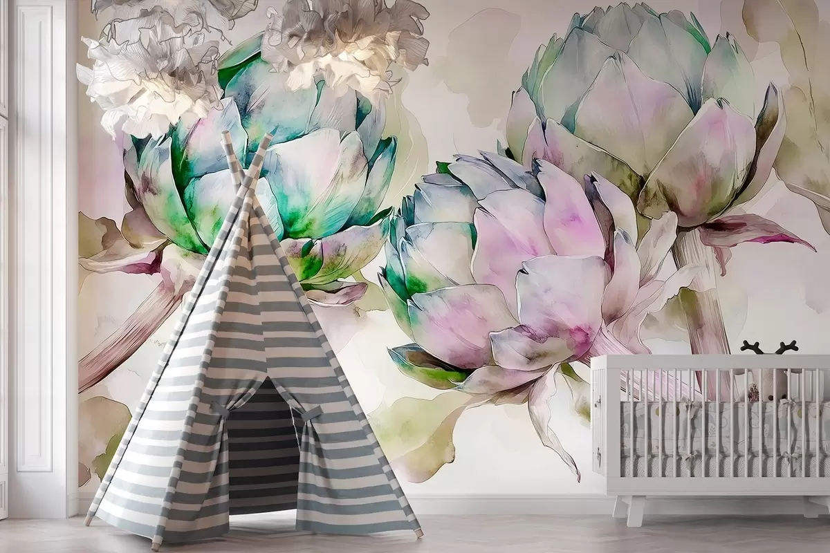 Fototapeta Karczochy w stylu akwareli, kwiaty, fiolet i zieleń w02481