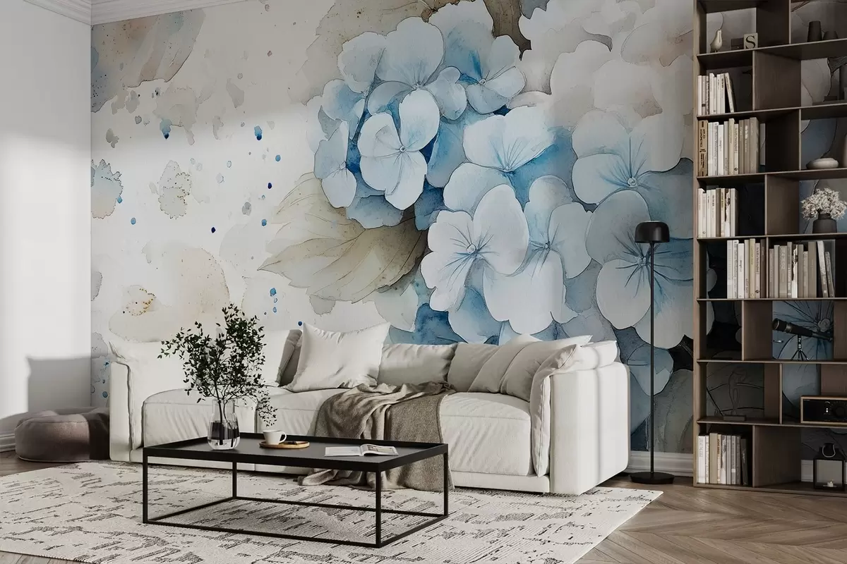 Fototapeta Akwarelowy rysunek kwiatów hortensji z liśćmi, delikatne naturalne kolory Nr w02493