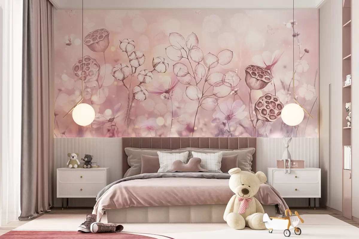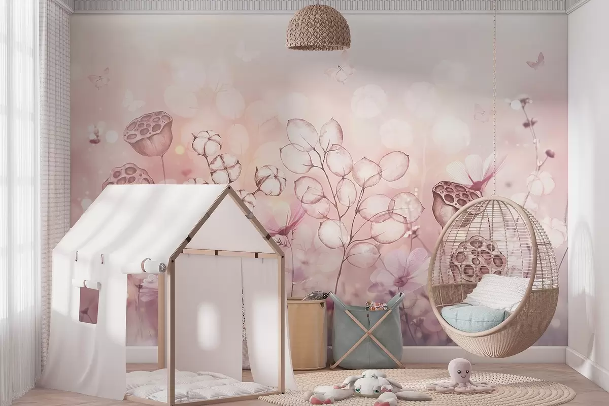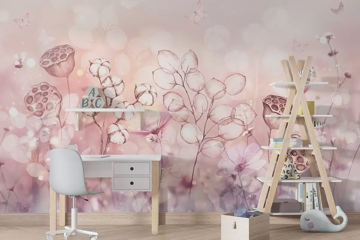 Fototapeta Marzycielski ogród kwiatowy, motyl, bawełniane kwiaty, lotosy, różowe kolory Nr w02516