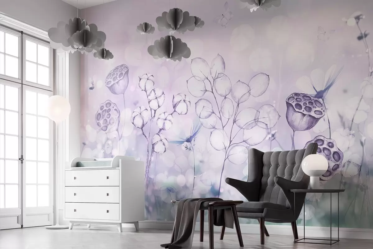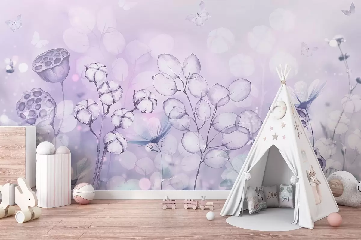Fototapeta Marzycielski ogród kwiatowy, motyl, bawełniane kwiaty, lotosy, fioletowe kolory Nr w02516v1