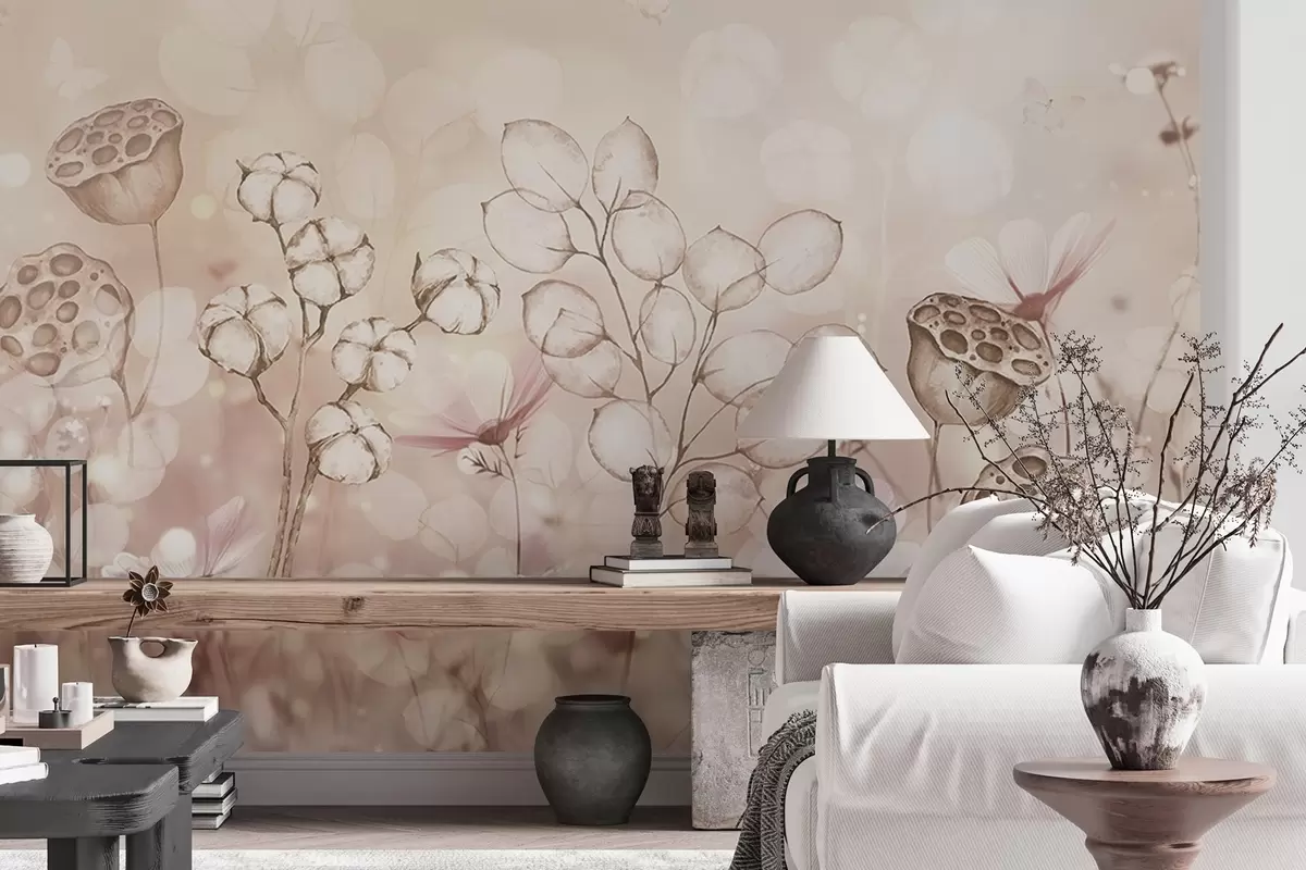Fototapeta Marzycielski ogród kwiatowy, motyl, bawełniane kwiaty, lotosy, beżowe kolory Nr w02516v3