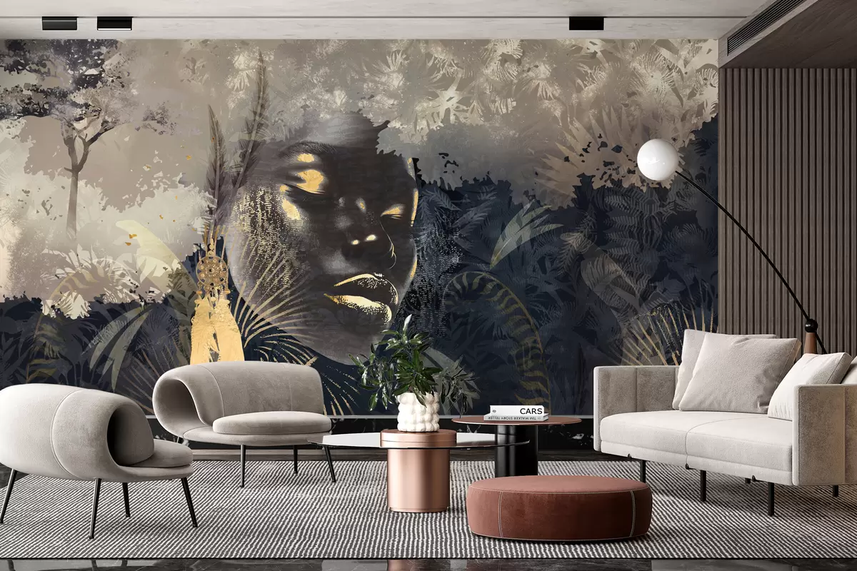 Fototapeta Magiczna Afryka z lasem deszczowym, dziewczęcymi i wektorowymi elementami z niebieskim odcieniem Nr w02642v1