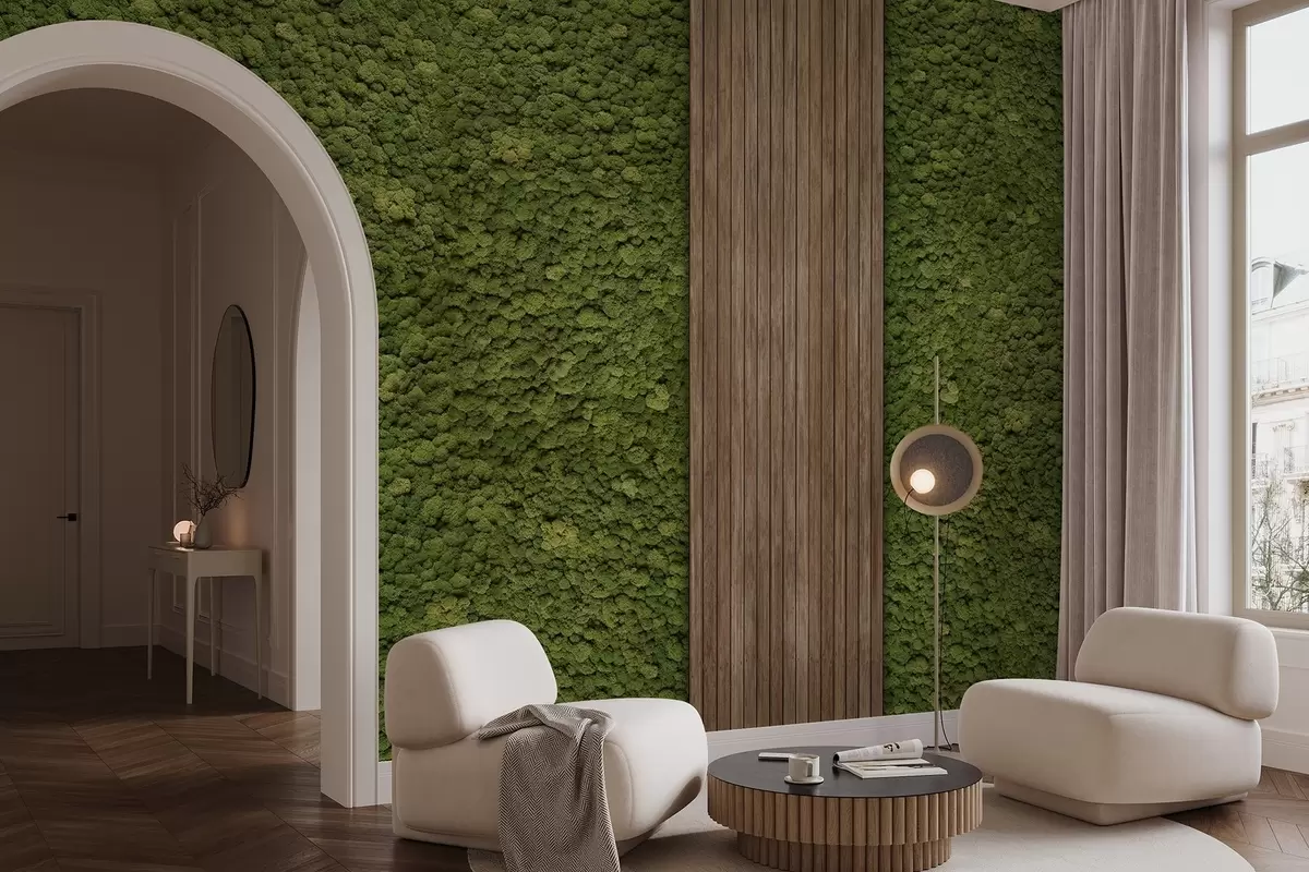 Fototapeta Ściana w stylu mchu z drewnianym panelem, bujne oliwkowe kolory Nr w02656v3