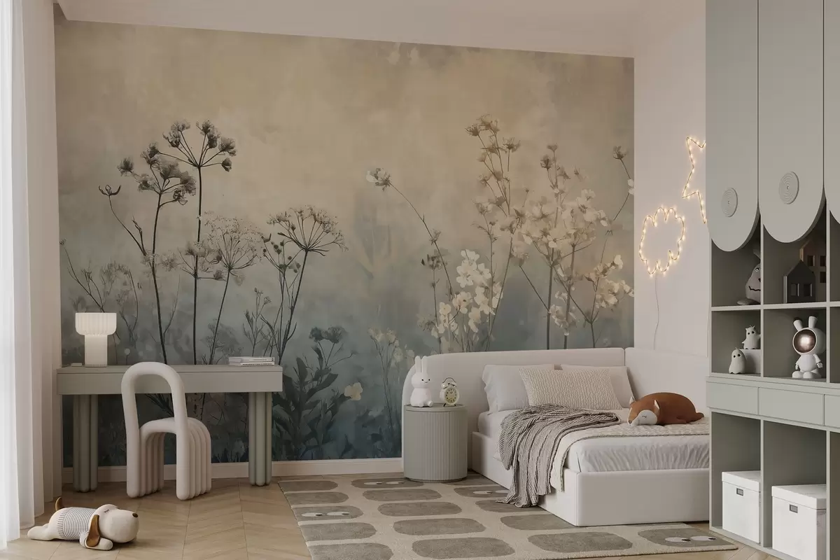 Fototapeta tapeta w stylu eko z polnymi kwiatami i roślinami na teksturowanym tle Nr w02685