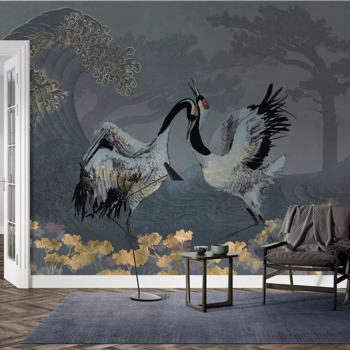 Fototapeta Żurawie, drzewa i fale z elementami w stylu chińskim Nr w02747